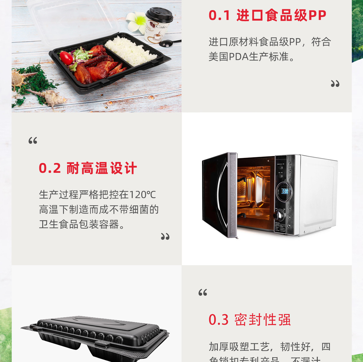 一次性pp飯盒帶蓋封口黑色方形兩格格快餐盒